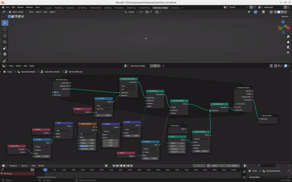 The framework extends the existing Geometry Nodes system to support particle-based modeling. You can poke in the experimental assembly.