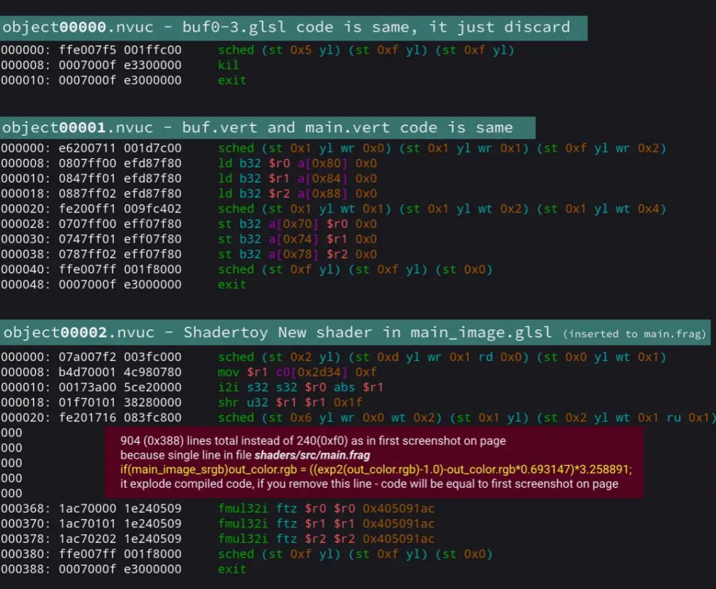 This article shows how to decompile NVidia OpenGL and Vulkan shaders, what tools are needed to decompress Nvidia caches and rename shaders. Additionally, a couple of examples of optimizations and their impact on the generated assembly are presented.