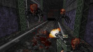 Shelly “Bombshell” Harrison takes on a quest to slay evil transhumanist mastermind Dr. Jadus Heskel in the streets of Neo DC. She leaves a trail of carnage throughout huge, multi-path levels filled with gigantic explosions, more secret areas than we can count, and inhuman foes behind every corner. There’s no regenerating health here; stop taking cover and start running and gunning.